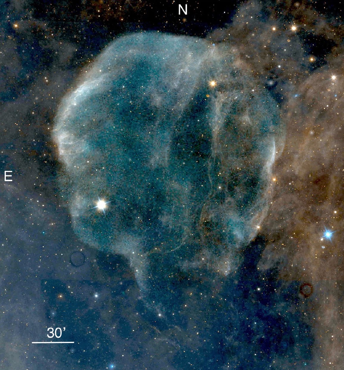 The Cygnus Loop (also known as the Veil Nebula) is a supernova remnant, the detritus of the explosive death of a massive star about ten to twenty thousand years ago. Detailed modeling of its spectacular filamentary shape suggests that the explosion occurred inside an interstellar cavity created by the progenitor star. As is common in astronomy, many of the precise physical properties of the object are rendered uncertain by the uncertainty of its distance. For decades scientists used a value of about 2500 light-years based on analyses of its gas motions by Hubble in 1937 and Minkowski in 1958. Many recent distance estimates have varied over a wide range generally consistent with this one, but the most cited value is a 2005 measurement of between 1500 and 2100 light-years.